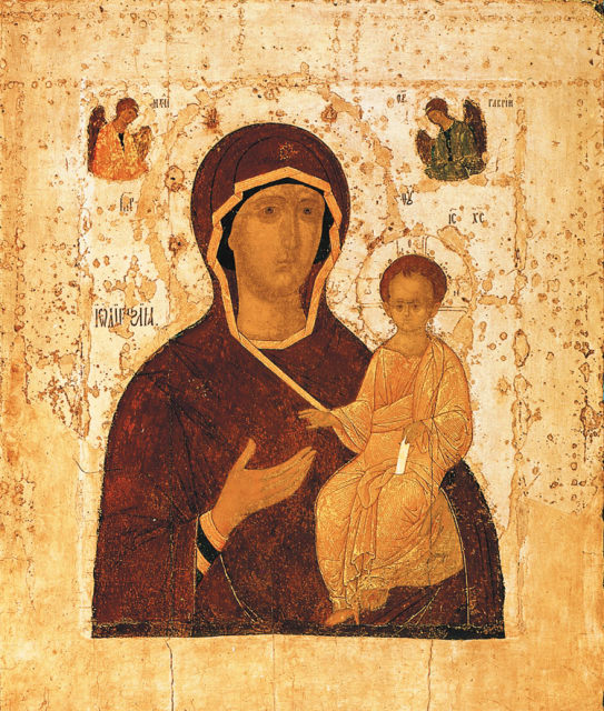 В переводе с греческого «Одигитрия» – «Путеводительница», то есть та, которая сопровождает и оберегает человека на пути к Царству Небесному. Богоматерь в этом иконографическом типе изображают фронтально, с сидящим на левой руке Младенцем Христом, правая рука поднята к груди в молитвенном жесте. В верхних углах иконы – склоненные полуфигуры архангелов Михаила и Гавриила.