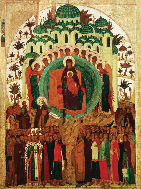 Иконы и фрески, иллюстрирующие богослужебные песнопения, были распространены в Византии и на Балканах с XIV века. На Руси подобные изображения стали особенно популярны на рубеже XV – XVI веков. Основные элементы композиции соответствуют стихам песнопения. Образ Богоматери на престоле окружен «ангельским собором». «Человеческий род», устремленный к Богородице, представлен собором всех святых во главе с Иоанном Предтечей. Композицию венчает образ храма-рая. В иконе передается ощущение единого богослужебного действия, связывающего всех его участников. Жизненный смысл этой иконы в том, что «мир не есть хаос. <…> Есть любящее сердце матери, которое должно собрать вокруг себя вселенную» (Е. Трубецкой).