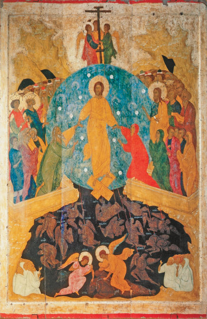 Сюжет иконы взят из апокрифического Евангелия от Никодима. Сатана, узнав о смерти Спасителя, приказал запереть двери ада, где томились все грешные души со времени изгнания Адама и Евы из рая. В час Воскресения Христова двери ада рухнули. Сойдя в ад, Христос приказал ангелам связать Сатану, а сам, простив Адама и Еву, вывел их с другими праведниками из ада. На иконе Христос изображен в небесно-голубом круге Славы, внутри которого ангелы с белыми свитками, на которых написаны названия добродетелей: милость, покаяние, мир, правда… Христос подает руки Адаму и Еве, выходящим из гробов, другие люди взирают на Спасителя с радостной надеждой. В глубине пещеры ада два ангела пленяют Сатану. В верхней части иконы три ангела торжественно воздвигают крест – символ Воскресения.