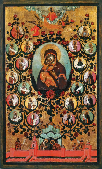 Древо государства Московского сажают московский князь Иван Калита и первый московский митрополит Петр, ветви которого прорастают сквозь Успенский собор. Образ Владимирской Божьей Матери – главной покровительницы и заступницы Русского государства – осеняет и объединяет собой все древо. На его ветвях цветут пышные розово-красные цветы, свисают виноградные грозди как напоминание о райском саде, который ожидает праведников. Среди этих «райских кущ» плоды древа государства Московского – медальоны с обликами владык духовных и светских, которые своими неустанными трудами и подвигами способствовали росту и процветанию этого древа.