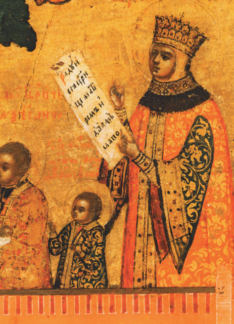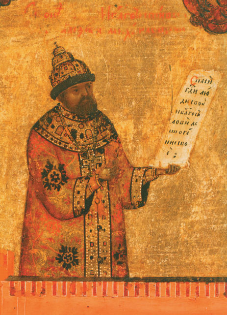 В верхней части иконы, среди небесного сияния, Христос держит царский венец и ризу для Алексея Михайловича в знак того, что царская власть дается от Бога.