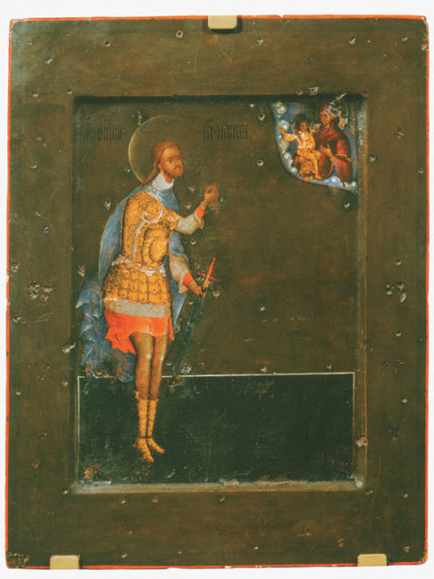 Прокопий Чирин – один из самых знаменитых «государевых мастеров» «строгановской школы». Данная икона создавалась по заказу Никиты Григорьевича Строганова и находилась в Благовещенском соборе Сольвычегодска. Патрон заказчика, св. Никита, жил в IV веке; за исповедование христианства он был брошен врагами в огонь, но остался невредим. Характерная «мелочность» письма, изысканность рисунка и цвета, обилие орнамента превращают икону в виртуозно выполненную, драгоценную священную реликвию. Поражают красотой доспехи святого: голубой плащ с живописными складками, золотая, расписанная тонким узором кольчуга, ярко-красный подол нижней рубахи, украшенная драгоценными камнями рукоятка меча… Хрупкая, бесплотная, вытянутая фигура святого напоминает пламенеющую свечу – он весь устремлен к Богородице, которая благословляет его в верхнем сегменте иконы.