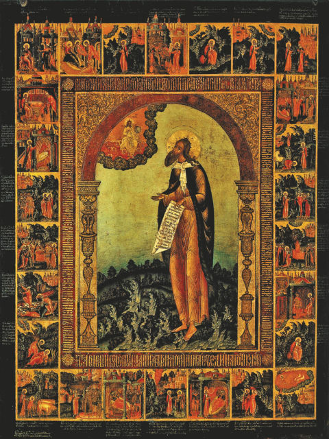 Сергий Радонежский (1314–1392) – основатель Троице-Сергиевой лавры, великий русский святой, «игумен» (т. е. настоятель) земли Русской. Своим духовным авторитетом он предотвращал усобицы, способствовал укреплению единого государства, освобождению от монголо-татарского ига. Изображение Сергия в среднике иконы носит портретный характер: характерное скуластое лицо, чуть раскосые глаза, светлые густые волосы… В лике святого – вся глубина и сила скорби о всей земле Русской. В основе клейм – житие Сергия, написанное в XV веке его учеником Епифанием Премудрым.
