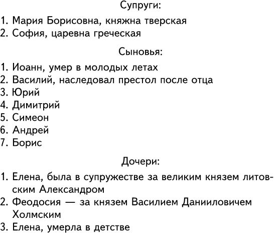 Иоанн, счастливый почти во всем, был несчастлив только в семействе своем. От первой супруги был у него сын Иоанн, которого для отличия от отца называли Иоанном Молодым. Вы помните, что он женился на молдавской княжне Елене. Этот молодой князь, кроткий и ласковый ко всем, через два года после свадьбы скончался. У него остался маленький сын Димитрий. Иоанн сильно огорчен был этой жестокой потерей, и никто не мог утешить его горести, кроме милого внука, малютки Димитрия. Любовь его к этому ребенку сделалась так велика, что великая княгиня София начала досадовать: у нее были свои дети, и нежной, огорченной матери казалось, что супруг ее менее любит их с тех пор, как родился Димитрий. Она имела и другую причину досадовать на этого мальчика: гордая царевна греческая думала, что старший сын ее Василий имеет больше прав быть наследником отцовского престола, нежели внук. Так думала не она одна, но и многие из приверженных ей бояр. Между тем другие находили, что по всей справедливости престол должен принадлежать Димитрию, сыну прежнего наследника. Мать его княгиня Елена, столь же честолюбивая, как и София, старалась всеми силами поддерживать это мнение. Таким образом, двор разделился, и каждый боярин был или друг, или враг той или другой княгини. Маленькие князья, окруженные каждый своими, росли не любя друг друга.