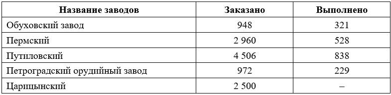 Из материалов ГАУ, представленных председателю Верховной следственной комиссии осенью 1915 г.72, видно, что артиллерийские заводы внутри страны имели заказов на 11.886 орудий разных систем, из них на 1 сентября 1915 г. было поставлено 1916 орудий. По отдельным заводам данные таковы: