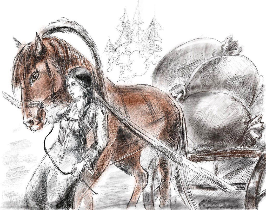 – Ну, как знаешь, – сказал мельник, помог ей запрячь коня, ещё раз проверил телегу на прочность, погрузил муку. – Что ж, ступай себе с Богом, да осторожнее там, глядите в оба, если что, возвращайтесь, я тут буду.