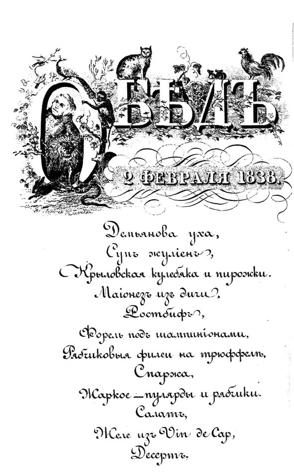 Гости, прибывавшие на юбилей, по-видимому, получали по экземпляру этой брошюры, где, помимо текстов основных речей и тостов, содержался общий сценарий празднования, а также перечень музыкальных произведений[99], которые должны были его сопровождать. В этом можно заметить влияние традиции «летучих» листков, предназначенных для участников театрализованных увеселений[100]; не случайно Оленин в шутку называл брошюру «нашим libretto» и «крыловой тетрадкой»[101]. Уникальной особенностью этого издания, отличающей его от брошюр с описаниями других юбилеев тех лет, стало отсутствие в нем биографии Крылова. При этом участники обеда находили у своих приборов изящно оформленное меню с виньеткой, включающей портрет баснописца в окружении животных и птиц – персонажей его произведений[102]. Такое замещение выглядит курьезным, однако в нем нашел отражение существенный аспект восприятия Крылова современниками, для которых легендарный аппетит баснописца был не менее важен, чем его творчество. При этом перечень обычных для банкетов блюд французской кухни открывался «литературными» русскими кушаньями, шутливо названными «Демьянова уха» и «Крыловская кулебяка и пирожки».