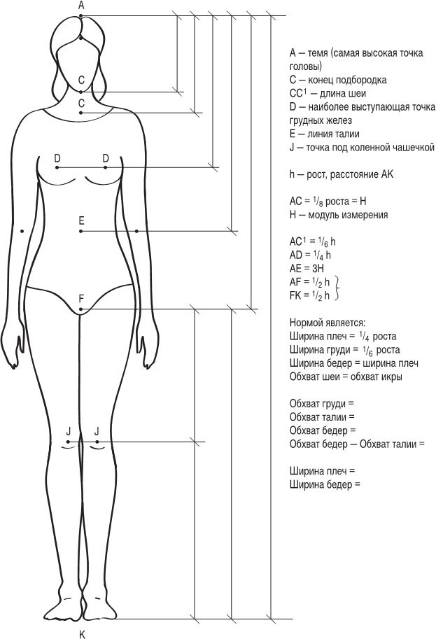 Теперь переходим к следующему этапу. Необходимо сделать плоскостные и объемные обмеры вашей фигуры. Для этого вам понадобятся инструменты: рулетка, сантиметровая лента, большой угольник (это может быть портновское лекало, подойдет любой предмет крупного формата с прямым углом: книга, папка и т. д.), карандаш, резинка, рисунок пропорциональной фигуры, на котором вы будете записывать данные (см. рис. 1 на стр. 14). Снимите с него копию для подруги.