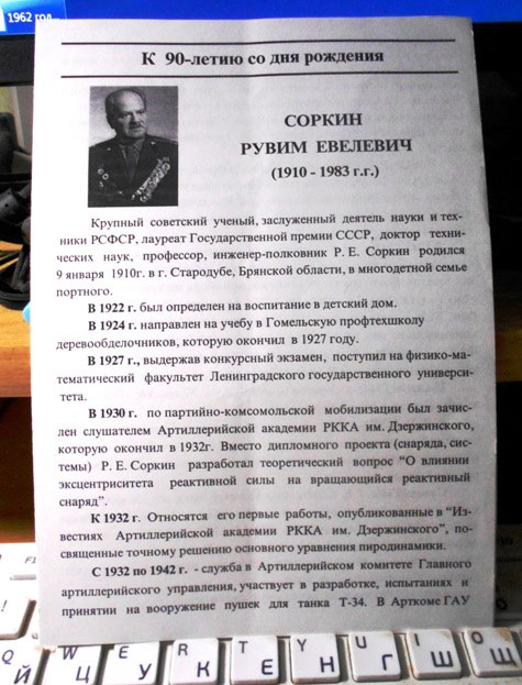 Я хочу рассказать о человеке, в ком было сильно развито, как у многих советских людей в годы войны, чувство патриотизма, беззаветная любовь к своей великой Родине. Он жил и работал в нашем городе военпредом на заводе им. Серго с 1950 по 1956 г.г. К сожалению, о нем нет никакого материала в музеях завода и города, его имя было засекречено, как имена многих других замечательных людей. Это Рувим Евелевич Соркин.