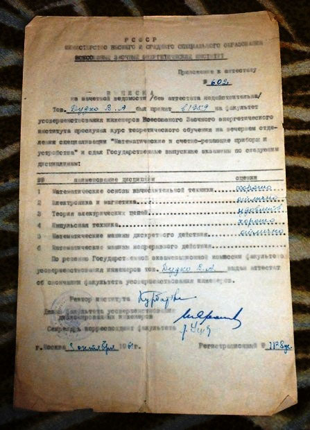 Тов. Дудко В. А. был принят в 1959 году на факультет усовершенствования инженеров Всесоюзного Заочного энергетического института прослушал курс теоретического обучения на вечернем отделении специализации «Математические и счётно-решающие приборы и устройства» и сдал Государственные выпускные экзамены по следующим дисциплинам: