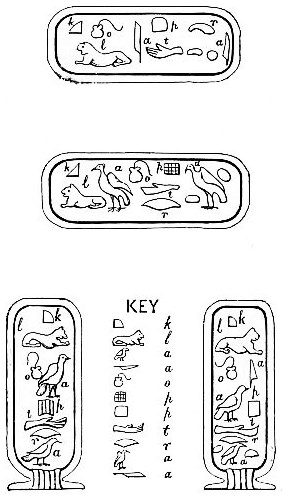 By a careful examination of these specimens, it will be seen that the order of placing the letters, if such hieroglyphical characters can be so called, is not regular, and the letter a, which is denoted by a bird in some of the specimens, is represented differently in others. There are also two characters at the close of each inscription which are not represented by any letter, the one being of the form of an egg, and the other a semicircle. These last are supposed to denote the sex of the sovereign whose name they are connected with, as they are found in many cases in inscriptions commemorative of princesses and queens. They are accordingly specimens of symbolic characters, while all the others in the name are phonetic.