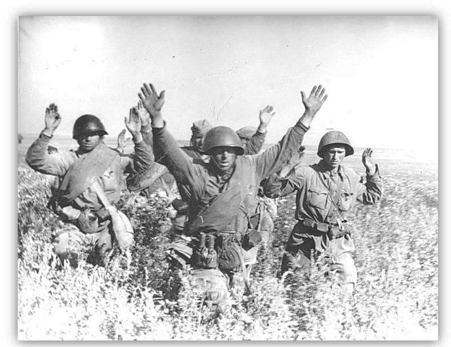 Трое здоровенных солдат спокойно поднимаются и со словами: «Цыц, щенок!», бросают в колодец свои винтовки и ремни вместе с подсумками и сапёрными лопатками. Потом они поднимают руки и, раскачиваясь из стороны в сторону на фоне голубого неба, идут к дороге навстречу немецкой колонне.