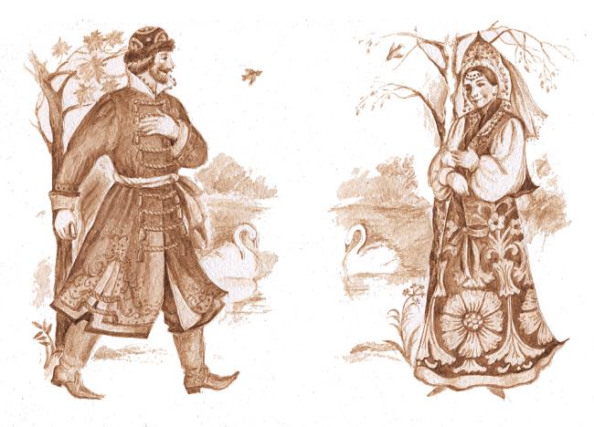 Где наши головы масленые, узорчатые, бороды чесаные, мухорчатые, усики витые бахромчатые? Где кафтаны смурные бархатные, шляпы бурые поярковые, кушаки шелковы-бухарские, армяки татарские, рубахи щегольские красные, рукавицы вырестковые, тисненые, шаровары полосатые, сапоги со каймою строченые, на рубахах запонки граненые, на кафтанах застежки золоченые? Ой было, было время на Руси, что ходил молодец в кафтане, ходила девка в сарафане!