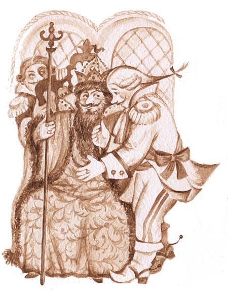И вдруг отколе что взялось, пошли Ивану опять прежняя милость царская, чины и деньги и лестные награды, и зажил он припеваючи домовитым хозяином, как ярославский мужик. И снова стал лукавый мучить завистью правдолюбивых, сердобольных министров царских, фельдмаршала Кашина, генерала Дюжина, губернатора графа Чихиря пяташную голову, и предложили они единодушно царю, чтобы Иван, молодой сержант, по крайней мере заслужил службою милость царскую, показал бы на деле рысь свою утиную лапчатую. Вследствие сего Иван, молодой сержант, на утро вычистился, белье натер человечьим мясом[1], брюки велел жене вымыть и выкатать, на себе высушил, словом, нарядился как на ординарцы, и явился ко двору. Царь Дадон, трепнув его по плечу, вызывал службу служить – «Рад стараться», – отвечал Иван. – «Чтобы ты мне, – продолжал царь, – за один день, за одну ночь, и всего за одни сутки, сосчитал, сколько сот, тысяч или миллионов зерен пшеницы в трех больших амбарах моих, и с рассветом доложил мне об этом. Если сочтешь верно, пойдет снова милость царская, пуще прежнего; а нет, так казнить, неповинную голову рубить!»