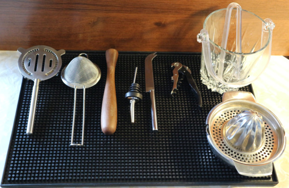 Необязательный инвентарь бармена. Слева направо: стрейнер, дабл-стрейнер, мадлер, дозатор, нож для бара, нарзанник, ведерко и щипцы для льда, сквизер