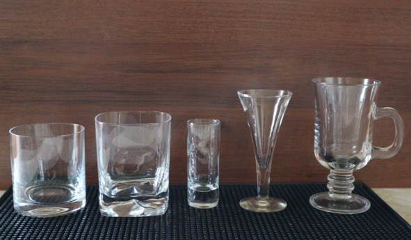 Слева направо: тумблер, олд фэшнд, шот, ликерная рюмка, бокал для «Айриш кофе»