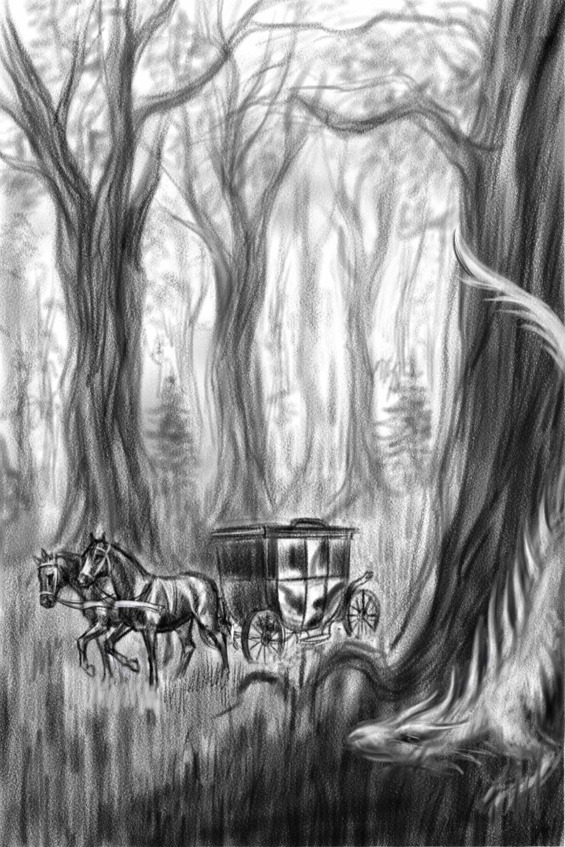 В это время бедная Люси решила взять себя в руки, перестать трястись от холода и посмотреть куда же они едут. Она с трудом взобралась на крышу кареты, жмурясь от сильного ветра. Онемевшие от холода пальцы скользили по золочёной поверхности крыши, крылья цеплялись за резные надписи: «С „Гоблин банком“ ты богат», «„Гоблин банк“ будет с тобой до конца твоих дней» и прочее. Прислонившись спиной к султану из малиновых страусовых перьев, венчавшему крышу кареты, фея огляделась. Они ехали по очень странному лесу. Деревья были словно покрыты густым слоем пепла, и под его бархатным серым мехом проглядывали чёрные угольные стволы. Такой же пепельной и хрупкой была трава, тронь – и рассыплется в пыль. Ни один рыжий или алый лист не нарушал темноты, клубящейся между деревьев. Не было слышно ни птиц, ни зверей, только ветер, который казался здесь единственным живым существом, качал узловатые мёртвые ветви, отчего те пронзительно скрипели. Особенно сильные его порывы ломали хрупкие истлевшие кончики травы, превращая их в пыль и туман. Словно живая мгла ползла по поверхности земли. Сердце Люси бешено застучало.