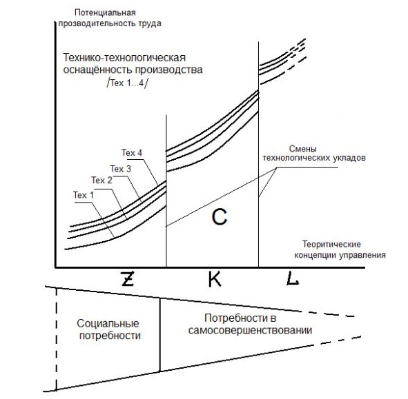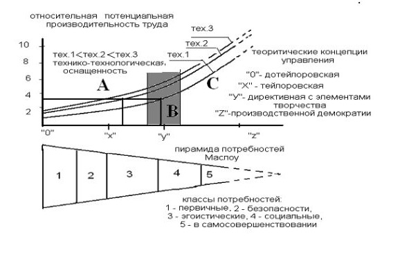 Тем не менее на рисунке оставлены зоны А, В и С поскольку в современных федерациях существуют тейлоровская и остальные теоретические концепции управления и все классы потребностей. Кроме того из рисунка видно, что за счёт улучшения управлением производством можно получить такую же производительность труда как и за счёт роста технико-технологической оснащенности производства.