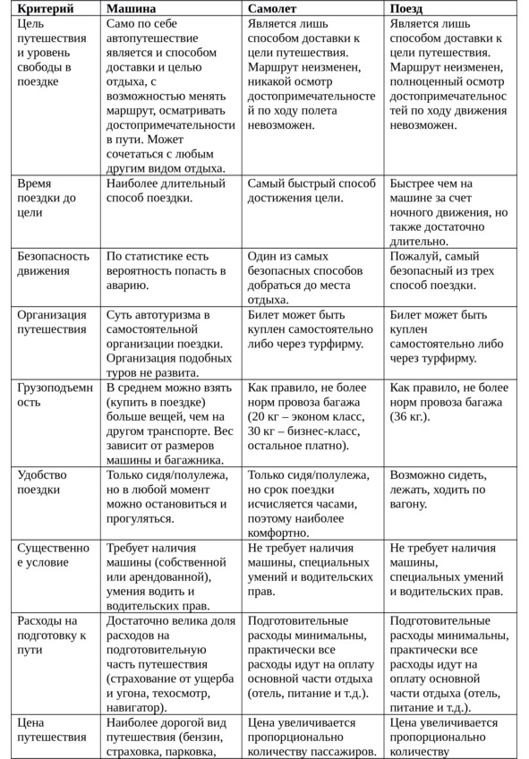 Однако автотуризм – это лишь один из видов путешествий и потому требует сравнения с турами на самолете и поезде. Говорить, что одно лучше, чем другое было бы неверно. Плюсы и минусы есть в каждом варианте, а выбор зависит от цели путешествия, конкретной ситуации, бюджета и предпочтений самого путешественника, наконец, наличия или отсутствия надеждой машины. Поэтому постараемся сравнить три этих способа путешествия.