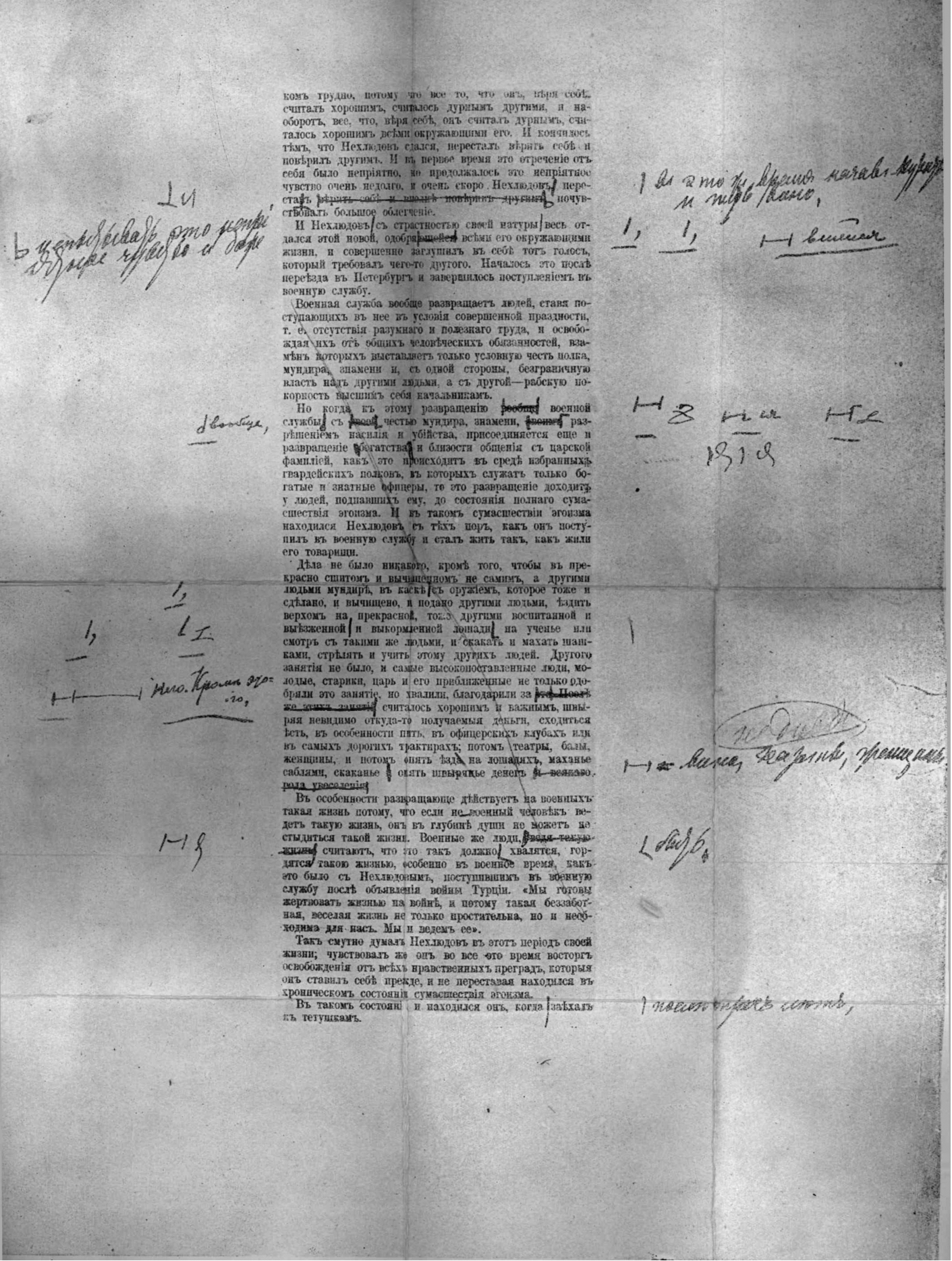 Корректура (окончательная) ХШ главы первой части «Воскресения» с исправлениями рукой Толстого и А. А. Русановой и с перечеркнутыми редактором «Нивы» (из цензурных соображений) четырьмя абзацами.