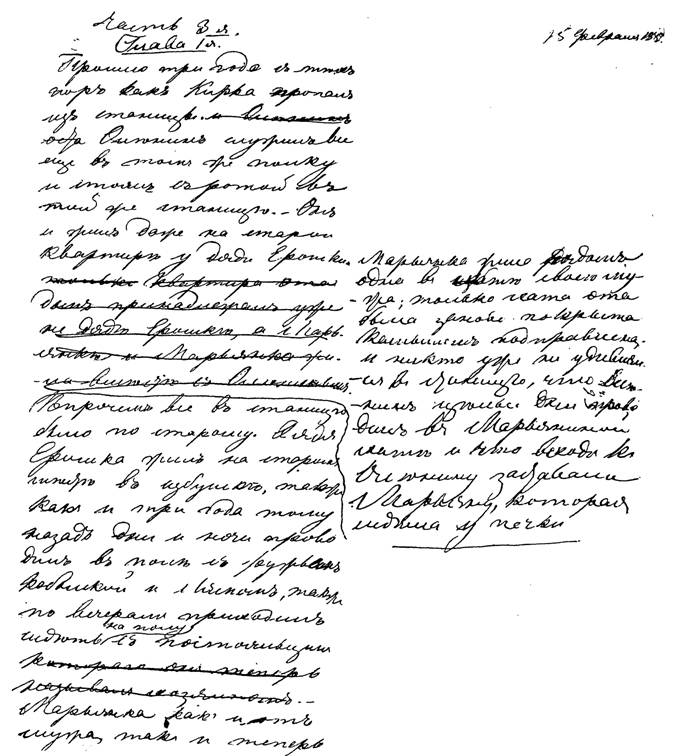 «Ты знаешь мою привычку соблюдать въ душевныхъ дѣлахъ обычаи немѣцкихъ хозяекъ: одинъ разъ послѣ долгаго время все повѣрить, перемывать, перестанавливать. Нынче цѣлый день я занимался такимъ мытьемъ и повѣркой. И было отчего. Со времени моего послѣдняго письма случилось со мной самое важное происшествіе въ жизни – я былъ счастливъ и продолжаю быть счастливъ. Но я растерялся въ первое время и только теперь въ походѣ, одинъ т. е. безъ нея, я въ первый разъ оглянулся на себя, вспомнилъ про свое существованіе и подумалъ о немъ. Ты ошибся, полагая, что я отрекусь отъ письма, которое писалъ тебѣ, что мнѣ стыдно станетъ. Прошло три мѣсяца и, вспоминая это письмо, мнѣ кажется только, что напрасно я вовсе писалъ тебѣ объ этомъ, – всего я высказать не могъ и сказалъ пошло, мало, бѣдно въ сравненіи съ тѣмъ, что есть. – Теперь не буду тебѣ писать ничего про «то» и какъ все случилось, скажу только, что я счастливъ, спокоенъ и чувствую себя сильнымъ, какъ никогда не былъ въ жизни. Жизнь моя теперь ясна для меня, я ужъ не одинъ и знаю свое мѣсто и знаю свою цѣль. – Жена моя – Марьяна, домъ мой – Новомлинская станица, цѣль моя – я счастливъ, вотъ моя цѣль. Кто счастливъ, тотъ правъ! – Какихъ же еще цѣлей, желаній, какой еще правды, когда чувствуешь себя на своемъ мѣстѣ во всемъ Божьемъ мірѣ, когда ничего больше не хочешь? – И я ничего не хочу, исключая того, чтобы не измѣнилось мое положеніе, хочу только отрѣзать себѣ всѣ пути отступленія изъ своего положенія, исключить все ненужное изъ моего свѣтлаго круга. —