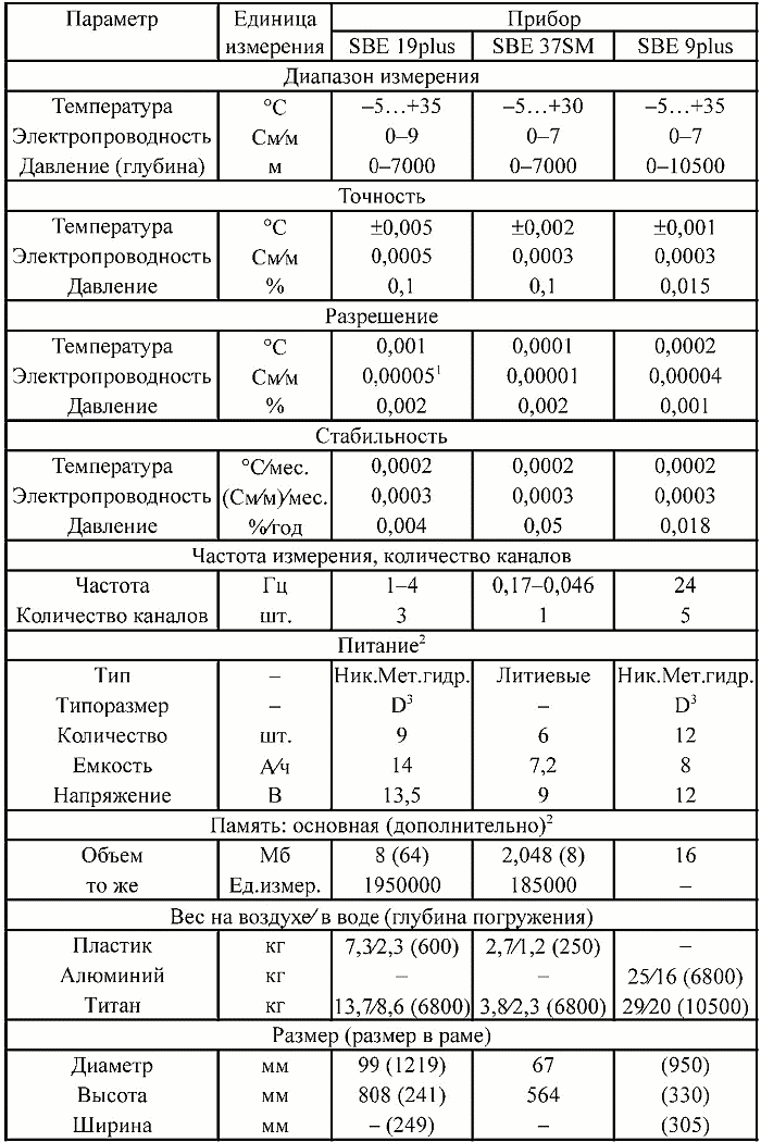 Примечания: 1 – разрешение от диапазона 0,0001 См/м для пресной воды до 0,0007 См/м при высокой солености; 2 – для зонда SBE 9plus CTD при работе в автономном режиме приведены характеристики дата-логгера SBE 17plus; 3 – никель-металлогидридные батареи (аккумуляторные), возможна установка щелочных типоразмера «D»