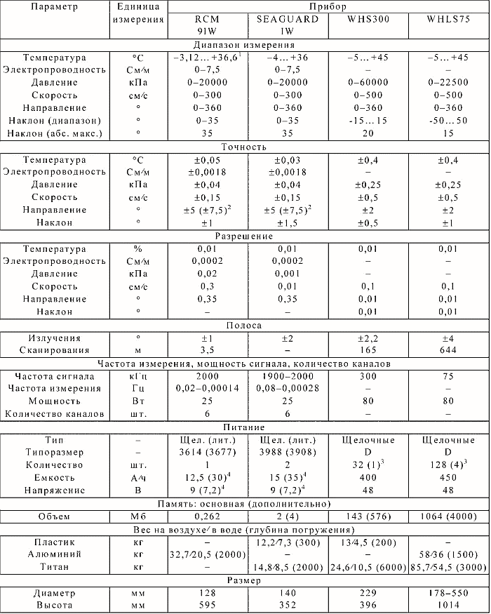 Таблица 4. Характеристики измерителей течений RCM 9IW и SEAGUARD RCM IW, профилографов течений WorkHorse Sentinel (WHS300), WorkHorse Long Ranger (WHLS75).