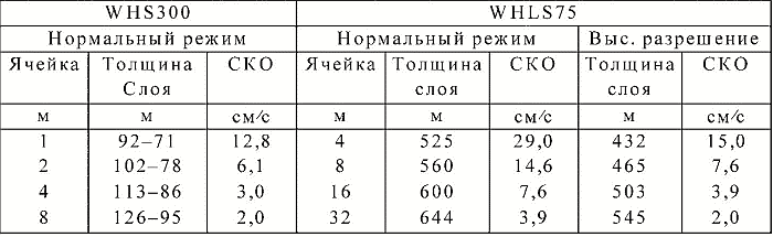 Таблица 5. Размер ячейки (слоя) измерения, общая толщина слоя и соответствующие им значения среднеквадратичного отклонения (СКО) скорости профилографов течений WHS300 и WHLS75