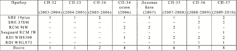 Таблица 6. Состав приборной базы (в единицах), активно используемой при проведении океанологических исследований на российских дрейфующих станциях «Северный полюс»
