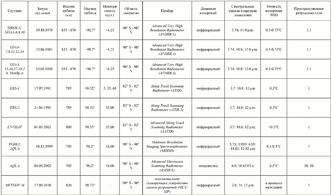 Таблица 1. Технические характеристики спутников и приборов, измеряющих ТПО