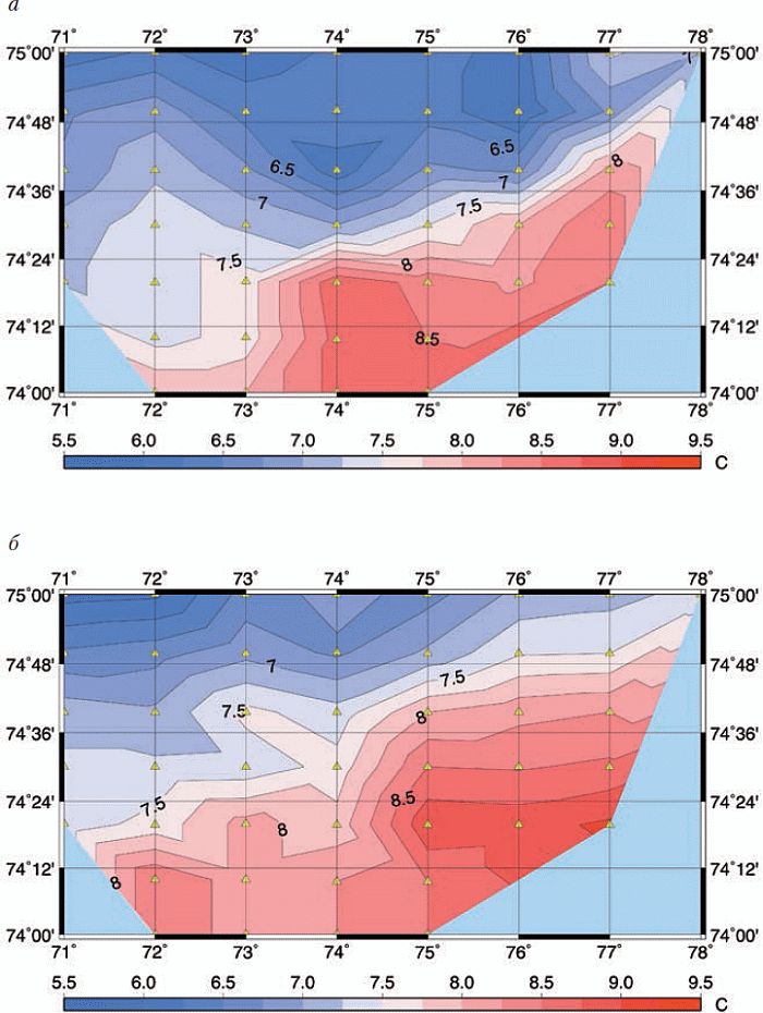 Достаточно большое количество результатов обработки измерений ТПО со спутников находятся в свободном доступе, как в цифровой форме, так и в виде изображений в сети Интернет. Для оценки возможности использования таких результатов обработки был проведен сравнительный анализ данных о ТПО, полученных CTD-зондированием (зонд SBE-19 plus) в экспедиции «БАРКАЛАВ-2008», организованной в рамках Международного Полярного года (МПГ), и со спутника AQUA камерой AMSR-E. На рис. 1 представлены карты распределения ТПО для полигонов в Карском море и море Лаптевых. Для построения этих карт использовались данные в цифровой форме (сайт ftp://podaac.jpl.nasa.gov/pub/GHRSST/data/L2P_GRIDDED/AMSRE/).