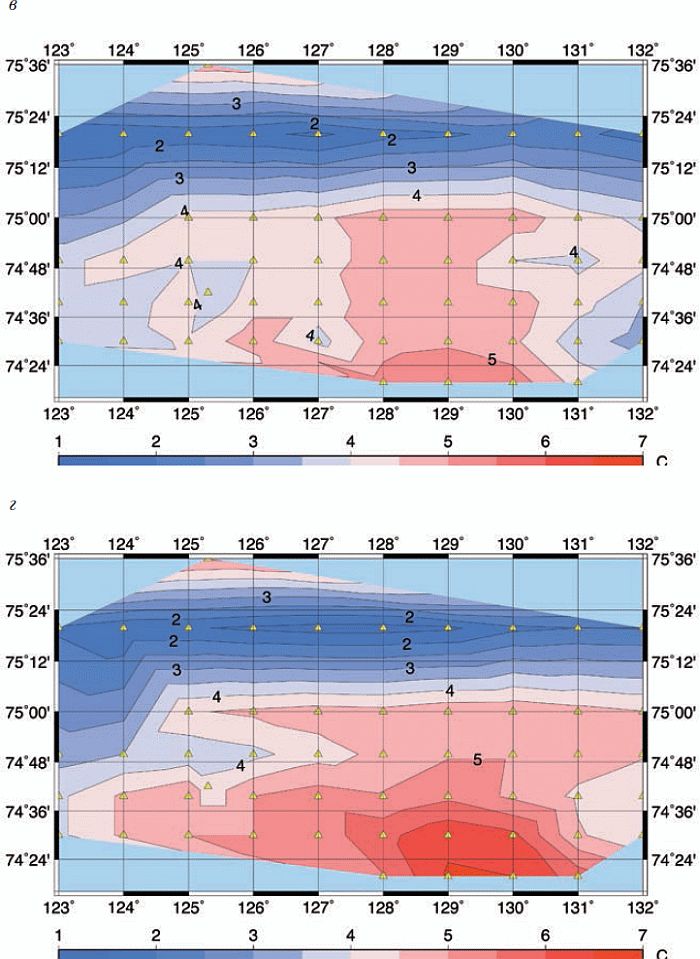Рис. 1 (продолжение). Карты распределения ТПО: на полигоне в Карском море (а, б) (август 2008 года), на полигоне в море Лаптевых (в, г) (сентябрь 2008 года); а), в) – по данным CTD-зондирования; б), г) – по данным спутниковых измерений