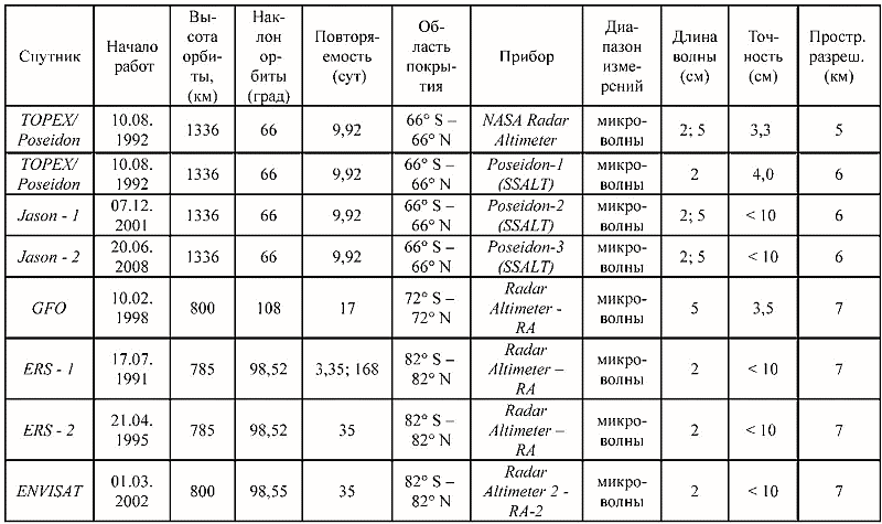 Изначально задачей альтиметрии являлось уточнение формы геоида и гравитационной модели Земли. Первые спутники (Skylab, Geos, Seasat), несущие на себе альтиметры, были запущены в США в 1970-х годах. Широкое внедрение спутниковой альтиметрии началось в 1990-х годах, когда были запущены два европейских космических аппарата ERS-1 и ERS-2 и спутник Topex/Poseidon, созданный в рамках французско-американского проекта для изучения циркуляции Мирового океана. Для продолжения миссии Topex/Poseidon в 2001 г. был запущен новый спутник Jason-1, а в 2008 г. – спутник Jason-2 (Фукс, Блошкина, 2007). Технические характеристики спутников и приборов представлены в таблице 2.