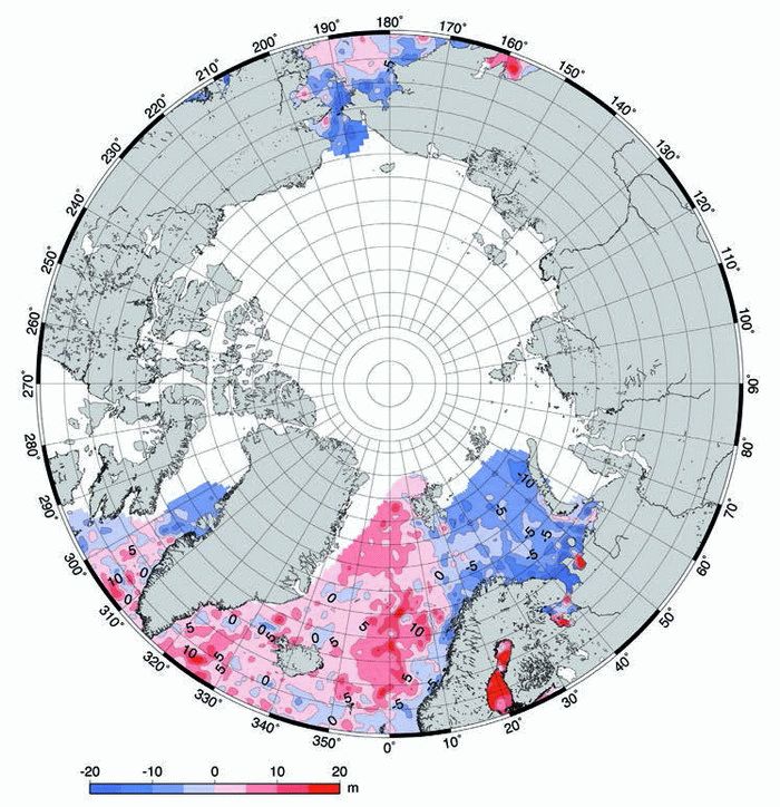 Уровень океанаПри исследовании динамических процессов важной характеристикой является уровень океана. В настоящее время существует очень мало измерений этой характеристики на открытой акватории СЛО. С развитием спутниковой океанологии появилась возможность получать в реальном времени данные о динамической топографии океана, что открыло широчайшие перспективы в исследовании динамики морей и океанов.