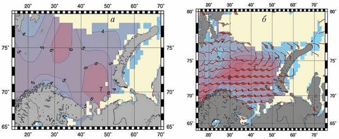 Рис. 3. Поле высот волн на 00 ч. UTC 27 января 2010 г.: а) – по спутниковым данным AVISO; б) – по модели ААНИИ
