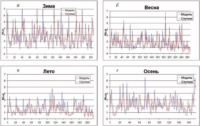 1. Верификация моделей ветрового волнения по данным спутниковых измеренийДля верификации была использована модель ветрового волнения ААНИИ (Лавренов, 1998; Давидан и др., 2010; Дымов и др., 2004), по которой было выполнено более 900 ежедневных прогнозов с января 2008 г. по июль 2010 г. Результаты прогнозов были сопоставлены со спутниковыми данными измерений высот волн в 10-ти точках акватории арктических морей за безледный период. На рис. 3 и 4 приведены примеры пространственного распределения высот волн и сезонный ход синхронных модельных и спутниковых данных в одной из точек, расположенной на акватории Баренцева моря.