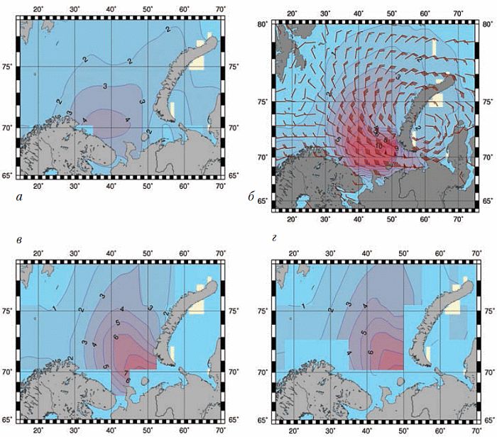 Современные спутники обеспечивают продолжительные серии наблюдений, однако попытки усвоения спутниковых данных AVISO о высоте волн показали, что гридированные данные, собранные за двое суток, совсем не годятся для оперативной ассимиляции. Это заключение подтверждается примером необычно сильного шторма в Баренцевом море в летний период 2010 года. В качестве примера на рис. 5 приводятся поля ветрового волнения, восстановленные по различным моделям и спутниковым данным AVISO, из которых видно, что по спутниковым данным (рис. 5 а) высоты ветрового волнения значительно занижены по сравнению с тремя модельными полями высот волн, представленными на рис. 5 б, 5 в и 5 г.