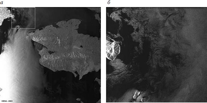 Рис. 6. Изображение района Берингова пролива, выполненное спутником ENVISAT 22 июня 2003 г.: а) – снимок 400×400 км ASAR, координаты центра снимка: 66,15° с.ш. и 166,25° з.д. Светлая часть снимка соответствует зоне интенсивного ветрового волнения; б) – увеличенный фрагмент снимка. На морской поверхности наблюдается сложная система тёмных спиралевидных структур, обусловленная динамическими процессами в прибрежной зоне