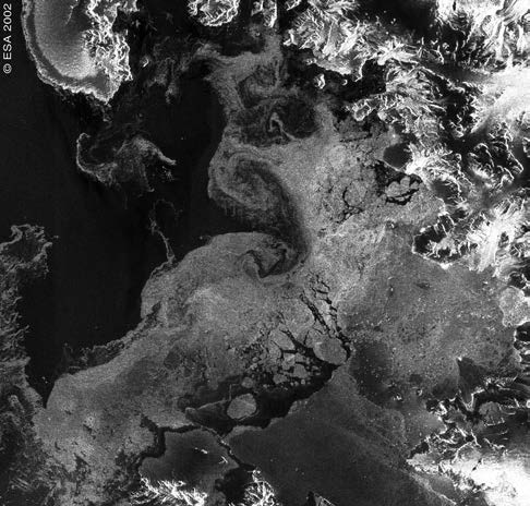 Рис. 7. Изображение района бухты Маргариты (западная часть Антарктического полуострова), выполненное спутником ENVISAT 18 марта 2002 г. В центре снимка на тёмном фоне чистой воды и светлого однолетнего дрейфующего льда обнаруживается диполь, состоящий из двух вихрей циклонической и антициклонической направленности вращения, диаметр каждого из которых составляет около 25 км