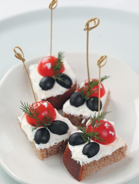 Черный хлеб нарезать ломтиками толщиной 0,5 см, разрезать на четыре части, смазать кремом из сыра фета. Помидоры черри и маслины разрезать пополам и положить на смазанные сыром ломтики хлеба, придавая форму божьей коровки.