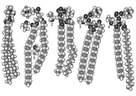 Показана часть липидов верхней половины бислоя. Тяжелые атомы обозначены серым цветом, атомы водорода – светло-серым, кислород – темным цветом. Верхние молекулы этанола (№ 1–4) находятся в зоне преимущественного связывания, ниже которого расположен интерфазный слой мембран, содержащий протоноакцепторы. Нижняя молекула этанола (молекула № 5) вызывает дефект упорядоченности алкильных «хвостов» липидных молекул.