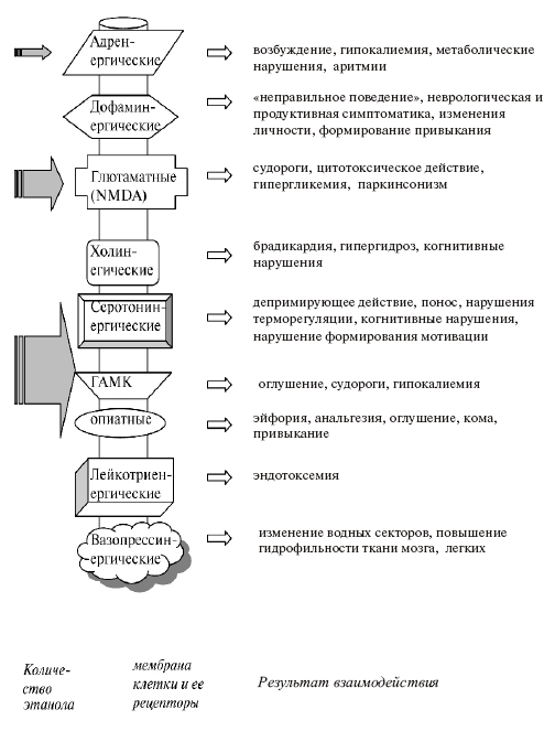 Действие алкоголя приводит к нейрохимическим изменениям в пределах локусов мозга с наибольшей плотностью тропных к нему рецепторов, таких как НМДА-, дофамин-, опиатергических, серотониновых и др. Однако последствия возбуждения рецепторов могут быть компенсированы еще пока не нарушенными метаболическими реакциями, протекающими в цитоплазме и ядрах клеток (например, глюконеогенез, гликолиз, синтез НАД, эвакуация ионов водорода, нейтрализация эндоперекисей и др.). Каждая группа рецепторов координирует определенные функции в организме человека. Постоянное возбуждение рецепторных систем может приводить к нарушению этих функций. Некоторые их них представлены на рисунке 3.