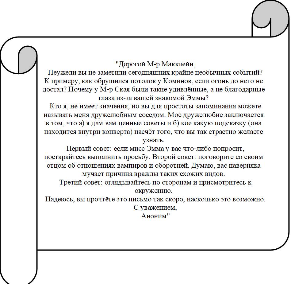 Вернувшись домой и перекусив, я уже думал спать, когда заметил на своём столе письмо. Когда мы уходили на вечеринку, его ещё не было. Письмо было анонимно.