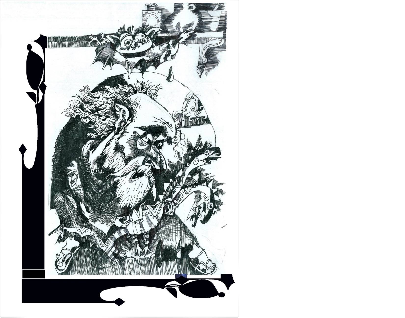 Это позвякивали и поскрипывали ножницы в руках колдуна. Да ещё к этим звукам прибавлялись его вскрикивания, всякий раз, когда ему приходилось уколоться огромной иглой из рыбной кости, в которую он вставлял паутину, заранее ловко скрученную его ученицей Летучей Мышкой.