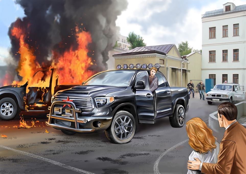 Звучит мощный автомобильный клаксон, и ребята вздрагивают от неожиданности. Сквозь дым и пламя, на полной скорости, отталкивая горящий бандитский автомобиль мощным «кенгурятником», появляется огромная чёрная «Тойота тундра» с прожекторами на крыше, на передней решётке рубиновая звезда. Автомобиль резко разворачивается, тормозит. Открывается дверь, Алёша секунду разглядывает ребят.