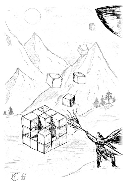 Таким методом Наинекс и поступил. Монотонно произнося слово «Гравилиэнто», он перекладывал по одному кусочку с площадки на постамент. Через изрядное количество времени туда был перенесён весь груз и сложен в куб. Довольный собой, Наинекс ушёл обратно в ряды наблюдателей.