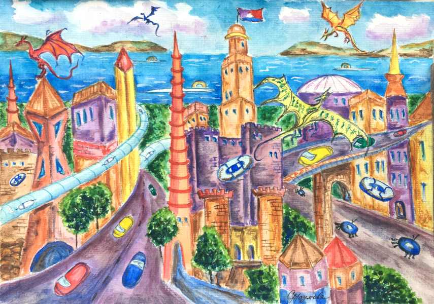 Единственный обитатель комнаты, Наинекс Неир, Правитель Нерфертии, самой могущественной страны на Лирее, встал с кровати и подошёл к огромному треугольному окну, занимавшему целую стену. Его глазам открылся прекрасный вид на множество больших и малых, высоких и низких домов Астиорадокса, столицы Нерфертии. От одного здания к другому стремились прозрачные трубы, по которым время от времени скользили капсулы воркоров. Между ними лавировали драконы разных цветов и форм, и, в одном потоке с ними, летели по своим делам летучие такси. Вдалеке виднелась морская гладь, по которой плавали разнообразные корабли.