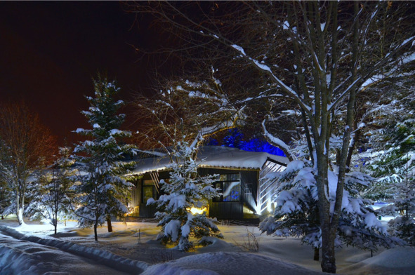 Голубоватый свет парковых фонарей и красно-оранжевое мерцание гирлянд над окнами ресторана удлиняли тени, заставляли их танцевать на оседающих сугробах и добавляли в идиллический пейзаж ноты сюрреализма.