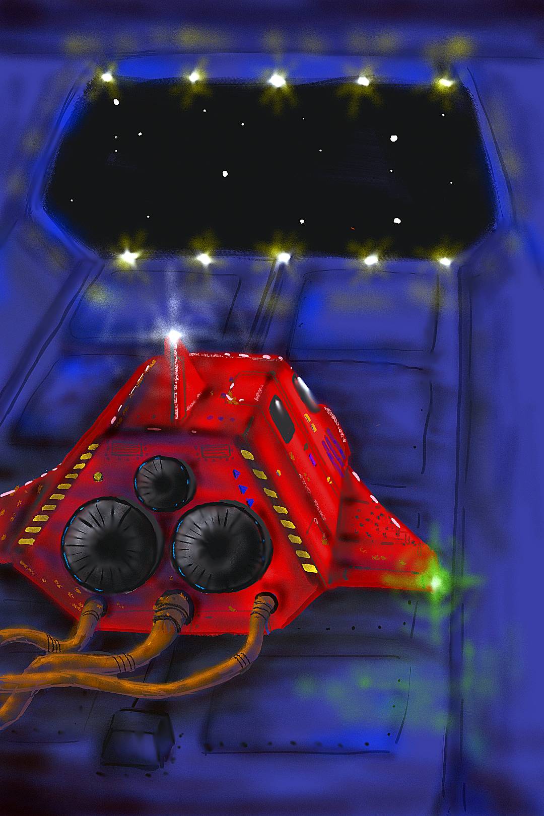 Авиационная катапульта резко с завыванием вытолкнула капсулу из отсека. Кабели снабжения, подключенные к капсуле на стоянке, как пуповина к ребёнку в утробе матери, от натяжения с шипением отстегнулись. Капсулу окутали холодные воды космоса. Через 5 секунд в пустых соплах двигателей загорелись огоньки, и она медленно стала удаляться от корабля.