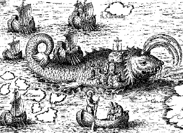 Святой Брендан и монахи в своем странствии. Средневековая гравюра